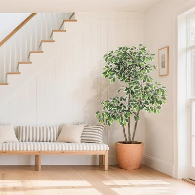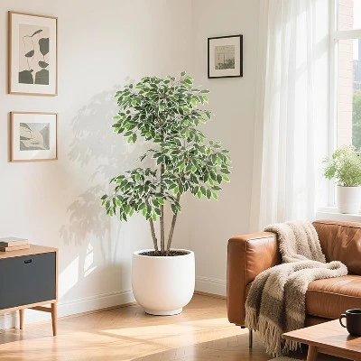 Natural Look And Real Touch : The trunk of the faux trees indoor is texture by trunks, complemented by white-edged leaves have a more design sense, soft texture, requiring a trained eye to spot the difference.A wide variety of natural colors enhances the realism of this faux silk tree.Sturdy Pot: The faux tree comes with a modern white tall pot (15.75″H x 9.05″W) seamlessly fitting styles from minimalist to modernism.Fake tree decor for home the inner of planter, made of durable clay mix, is topped covered with black pebbles—superior to traditional artificial moss—and doesn’t shed dust.The weighted base ensures added stability,making it an excellent choice for homes with pets or children.Adjustable & Sturdy:Trunks of this tall fake plants indoor outfitted with sturdy inner metal wires,the bendable trunks and stems offer easy shaping to reach the desired fullness and aspect.Evergreen Decor: No matter what season or place you are in, we can provide your home environment with different varieties of plants from any season.Also making it an ideal choice for this planta artificial para sala busy individuals or those without a green thumb. Say goodbye to wilting leaves and hello to effortless beauty.Are you dream to create your own oasis where you can escape and relax without leaving the comfort of your surroundings?Simply pop the faux trees for outdoor planters in and relax as you enjoy the natural, relaxed vibe it brings.this fake tree in Home and Kitchen will creates a finishing touch to any places. Please avoid direct sunlight and rain for outdoor use. It’s also a perfect gift choice on Parties, Housewarming, Birthdays,Weddings,etc.