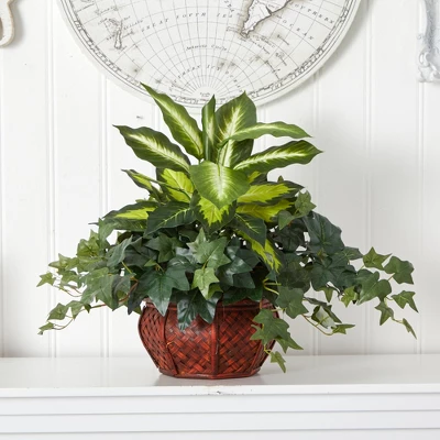 A bold combination that simply “works”, this Dieffenbachia and Ivy pairing will jazz up any area it adorns. The sharp angles of the ivy leaves contrast wonderfully with the bold, leafy Dieffenbachia, creating a look that is one part wild, and one part reserved. Perfectly displayed in a decorative planter, this wonderful specimen will never need a drop of water. Makes a thoughtful (and eclectic) gift as well.
