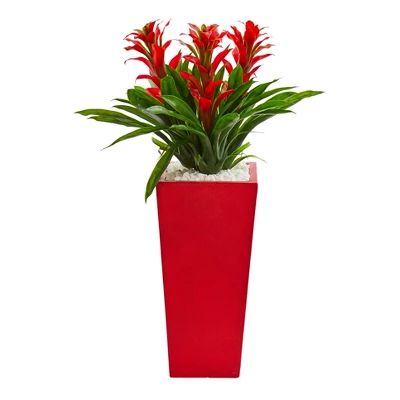 This artificial bromeliad plant has colorful, bold blooms and lifelike green leaves fanning out over the top of the included red tower vase. Made with care for realism, these blossoms look like they could actually be growing from the included red tower planter. Place this bromeliad near a faux palm or other tropical faux flowers for an island-inspired arrangement.