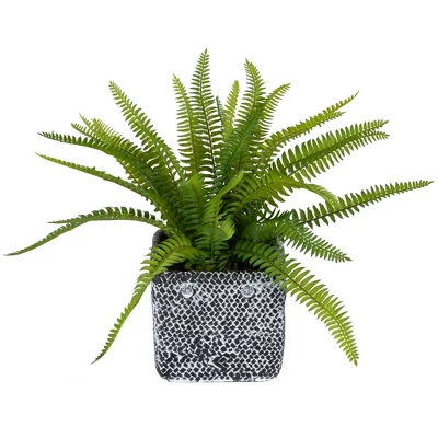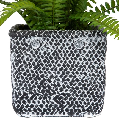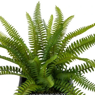 Zest your favorite places with this elegantly designed Boston fern in a distressed square black tin pot to elevate your home decor. This lively accessory is a must buy element for a refreshing setup. This irreplaceable plant decorative is available to suit your needs and match your decor.Product Features:This gorgeous Boston fern offers the beauty of greenery without the upkeepExtremely realistic plant is nestled in a black, distressed, tin pot with a lattice designFern is set in faux dirt that adds to the natural lookBase of stems are wired for easy positioningOverall dimensions: 20″ high x 30″ wide (at widest point) Pot dimensions: 8″H x 8″W x 8″LMaterial(s): tin/plastic/wire/fabric